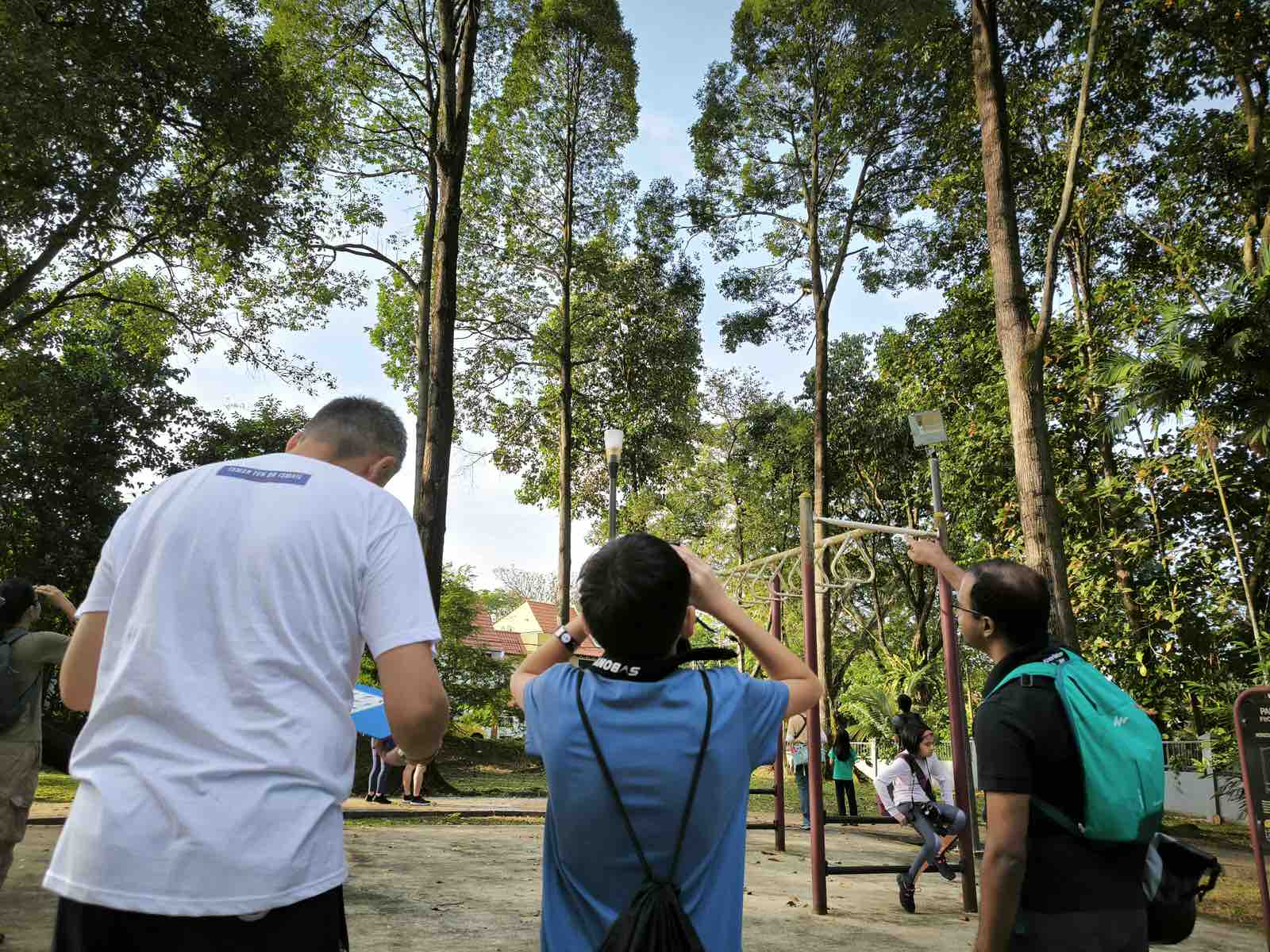 CAKE Mentors Tai Ping Ling, Wong Li Li, Liu Lai Wah, and Arhwin Kalai Chelvan guided the children and parents on how to use binoculars, and how to identify birds. A highlight was spotting a Buffy Fish-Owl (Ketupa ketupu), admired by all.
